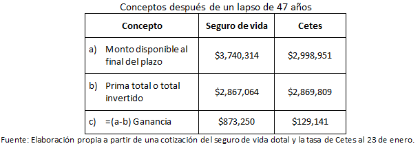 En el siguiente cuadro y gráfica comparamos la compra de un seguro de vida dotal y una inversión en Cetes. Supusimos: para ambos un periodo de 47 años; el seguro para un hombre de 18 años al inicio y mantuvimos constante una tasa de Cetes (4.5%).