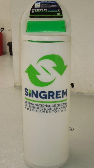 En México opera el Sistema Nacional de Gestión de Residuos de Envases y Medicamentos, A. C., (Singrem) esfuerzo de la industria farmacéutica para colocar contenedores, como los de la imagen, en farmacias y supermercados, así como hospitales públicos o privados. En ellos se depositan los medicamentos caducos o que no se desean, además de sus cajas y frascos, a fin de que destruirlos de forma adecuada.