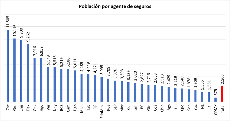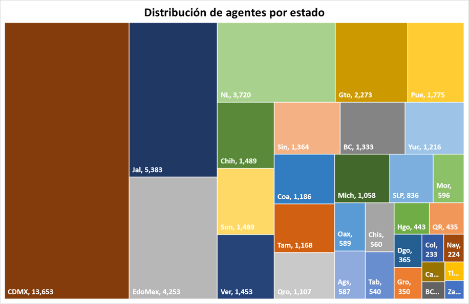 ¿Cuántos agentes de seguro hay en México? De acuerdo con la CNSF, consultada en julio de 2021, hay 50,296. La siguiente gráfica muestra que la mayoría se ubica en la Ciudad de México quedando al final Zacatecas con 141.