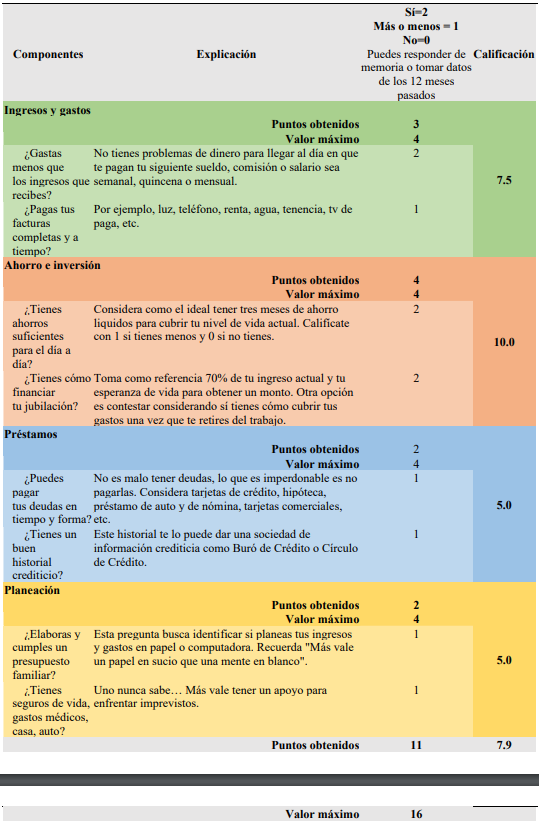 Los datos del cuadro muestran que la persona obtuvo una calificación de 7.9 (que se ve al final del cuadro), reprobando en los conceptos “Préstamos” y “Planeación” con 5.0. En consecuencia, debe realizar acciones que atiendan las cuatro preguntas que integran esos conceptos para mejorar su resultado.