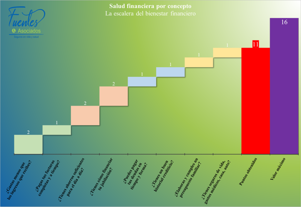 En Fuentes & Asociados colocamos las preguntas de cada componente en la hoja de cálculo anexa llamada “Evaluación de la salud financiera” para que al responder 8 preguntas de esos componentes tengas una calificación. Así podrás tomar medidas que te ayuden a subir de calificación, incrementar o mantener tu bienestar financiero y ¿por qué no? mejorar tu salud física y mental.