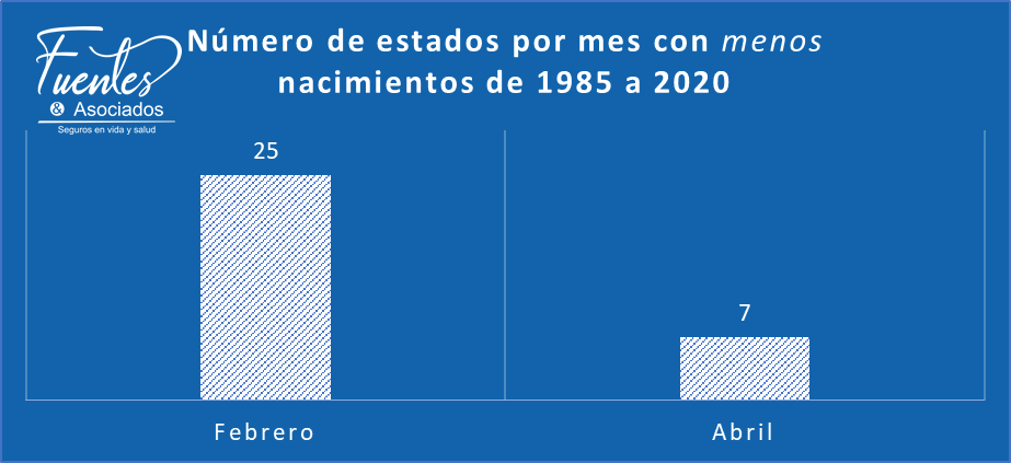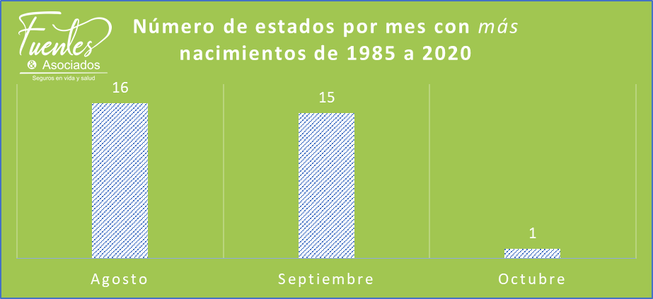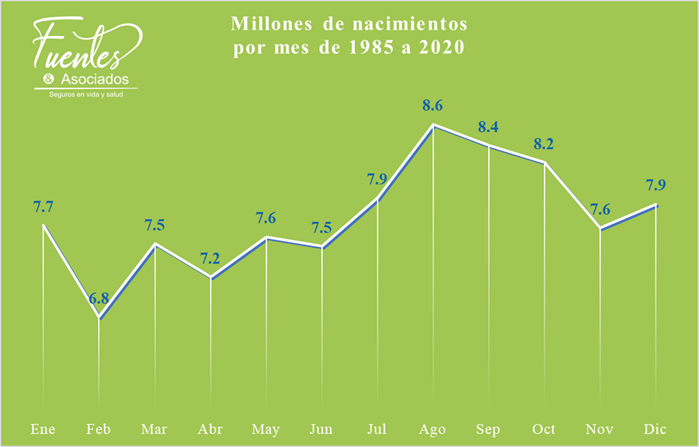 Antes de hablar del embarazo, quiero dar un poco de contexto. Revisamos el número de nacimientos de 1985 a 2020 publicado por el Instituto Nacional de Estadística y Geografía, el famoso Inegi. Encontramos que los 8.6 millones de bebés nacidos en agosto es la cifra más alta de los doce meses de cada año. Esta cantidad representa 9.2% del total anual. En el lugar contrario se encuentra febrero con la menor cantidad de nacimientos de 1985 a 2020: vieron la luz 6.8 millones de bebés. Esta cifra equivale a 7.4% de un año.