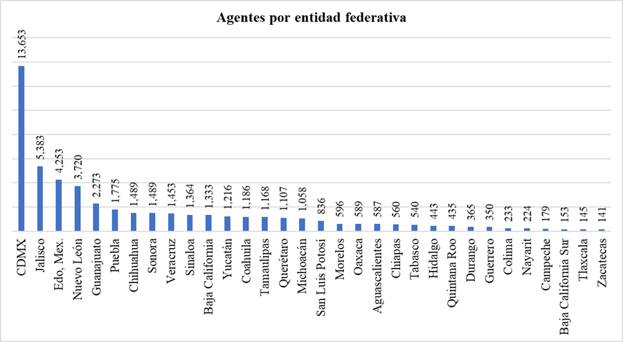 De acuerdo con datos de esa Comisión, en México hay poco más de 50 mil agentes en las 32 entidades del país. La CDMX es la entidad con más agentes (arriba de 13 mil), las cinco que le siguen superan los 15 mil y Zacatecas es la entidad que tiene menos (141).